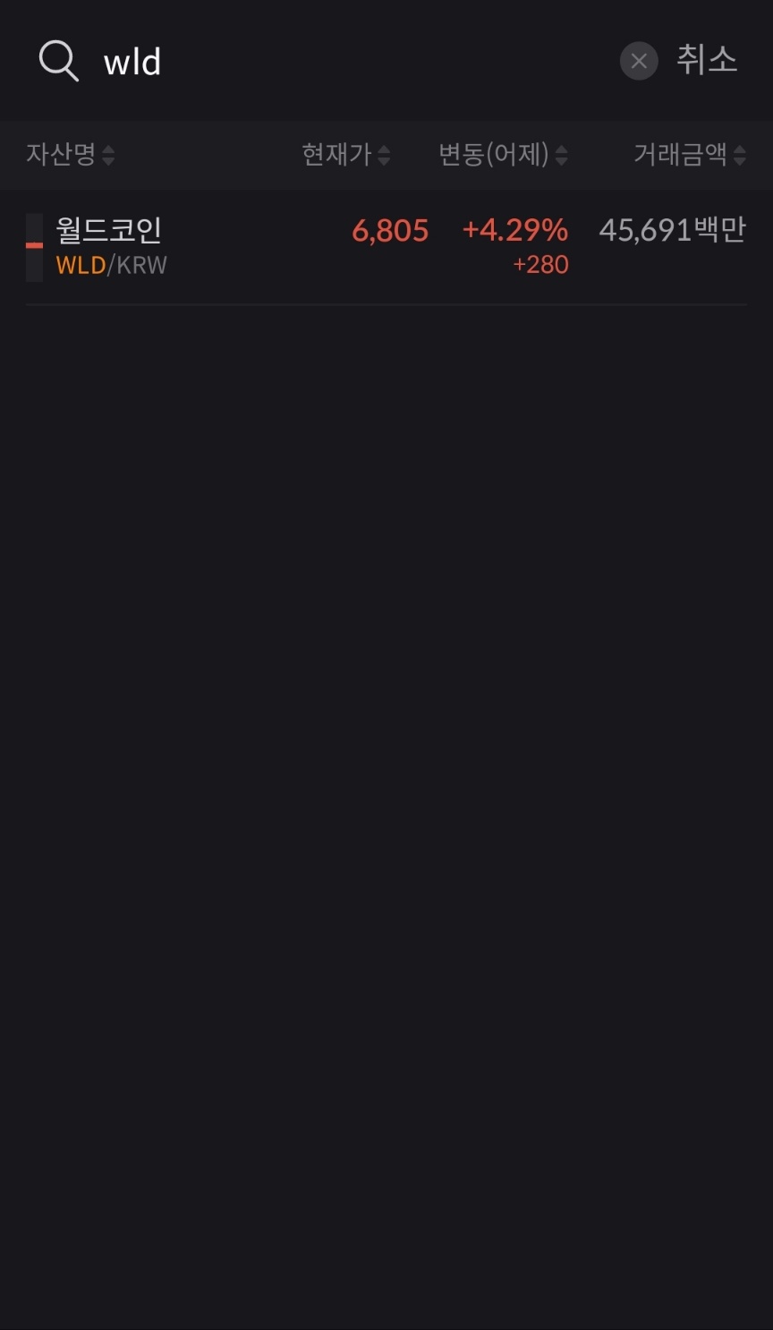 월드코인을 검색 시는 ' WLD '를 찾으시면 됩니다.